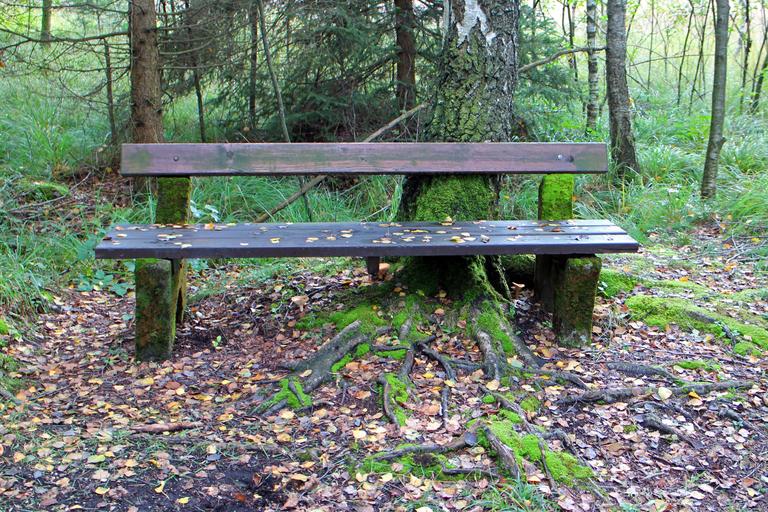 Keywords: bank wooden bench seat nature forest out rest sit click tree root root birch recover