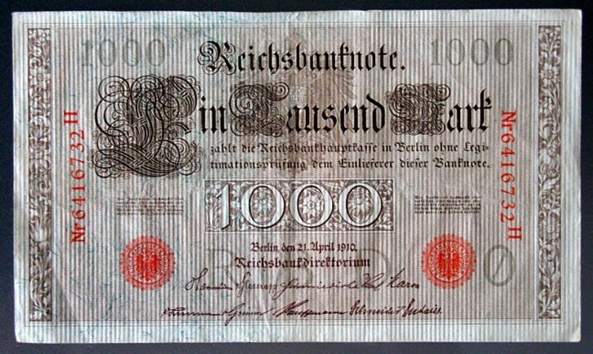 Keywords: Banknote11.jpg Banknote - 1000 Mark - Deutsches Reich - 21 04 1910 photo shooting 10 03 2006 waterborough Own work all rights released into public domain Mark banknotes of the German Empire 1000 191004214 Banknotes with a face value of 1000 |