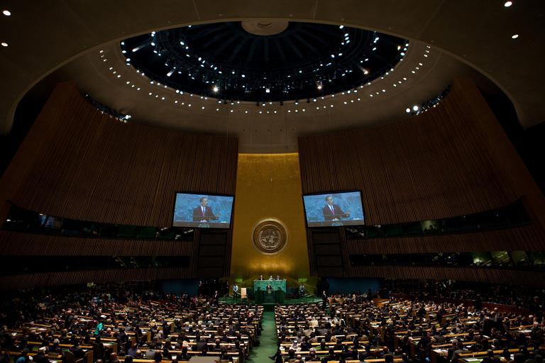 Keywords: Barack Obama addresses the United Nations General Assembly.jpg en President Barack Obama addresses the United Nations General Assembly at U N Headquarters in New York N Y Le président Barack Obama fait un discours de l'Assemblée générale des Nations unies au siège de l'ONU à New York The Official White House Photostream http //www flickr com/photos/whitehouse/3994561288/ White House Samantha Appleton 2009-09-23 PD-USGov Barack Obama in 2009 20090923 United Nations General Assembly hall Photographs by Samantha Appleton 20090923 People at the United Nations |