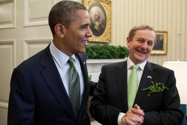 | Keywords: Barack Obama and Enda Kenny in the Oval Office 2012.jpg 38 897409 -77 037445 region US-DC_scale 1500_heading NE Barack Obama and Taoiseach Enda Kenny from Republic of Ireland Ireland during a meeting in the Oval Office on the morning of 20 March 2012 The President the Vice President Joe Biden and the Taoiseach later attended the Speaker of the United States House of Representatives House Speaker 's Friends of Ireland U S Congress Friends of Ireland luncheon held every year on or about Saint Patrick's Day in the United States Capitol Capitol Both men are wearing shamrock in their pockets and green ties to honour the Irish national holiday which occurred on 17 March 2012 Mr Kenny is also wearing an Ireland-America friendship lapel pin 2012-03-20 http //www flickr com/photos/whitehouse/6905307666 White House P032012PS-0222 Pete Souza PD-USGov Uploaded with UploadWizard Barack Obama in 2012 201203201119 Barack Obama in the Oval Office 201203201119 Enda Kenny in 2012 201203201119 Enda Kenny and Barack Obama 201203201119 Saint Patrick's Day in Washington D C 201203201119 Shamrocks 201203201119 March 2012 in the United States 201119 Photographs by Pete Souza 201203201119 Taken with Canon EOS 5D Mark II 201203201119 Uploaded by O'Dea 201203201119 Saint Patrick's Day 2012 Green neckties |