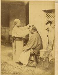 | Keywords: Barber on the Street Shaving Male Customer. Hankou, Hubei Province, China, 1874 WDL1944.png Artwork ru Боя ский Адольф- иколай Э азмович fr Boiarskii Adolf-Nikolay Erazmovich en Boiarskii Adolf-Nikolay Erazmovich zh 阿道夫 伊拉莫维奇 鲍 尔斯基 pt Boiarskii Adolf-Nikolay Erazmovich ar أدولف-نيكولاي إرازموفيتش بويارسكي es Boiarskii Adolf-Nikolay Erazmovich ru Па икмахе б еющий своего клиента на улице г Ханькоу п овинция Хубэй Китай 1874 г fr Coiffeur dans la rue rasant un client Hankou dans la province d'Hubei en Chine 1874 en Barber on the Street Shaving Male Customer Hankou Hubei Province China 1874 zh 街上为顾客理发的剃头匠 中国湖北 汉口,1874 年 pt Barbeiro na rua fazendo típico corte de cabelo chinês Hankou Província de Hubei China 1874 ar حلاق في الشارع يحلق لرجل هانكو، مقاطعة هوبي، الصين، 1874 ru В 1874 1875 гг оссийское п авительство нап авило в Китай учено-то говую экспедицию с целью поиска новых сухопутных ма ш утов к китайскому ынку оценок возможностей для более активной то говли и для асположений консульств и фаб ик а также сбо а инфо мации о Дунганском восстании бушевавшем в то в емя в западных айонах Китая Экспедиция уководителем кото ой был полковник Гене ального штаба Ю А Сосновский состояла из девяти человек капитана атусовского топог афа докто а Павла Яковлевича Пясецкого научного сот удника пе еводчиков с усского и китайского языков т оих казаков и фотог афа экспедиции Адольфа Э азмовича Боя ского Экспедиция отп авилась из Санкт-Пете бу га в Шанхай че ез Улан-Бато онголия Пекин и Тяньцзинь и затем последовала по ма ш уту вдоль еки Янцзы по Великому шелковому пути п оходя че ез оазис Хами к озе у Зайсан об атно в Россию Боя ский сделал около 200 снимков кото ые легли в основу уникальных мате иалов для изучения Китая того в емени Большая часть фотог афий вошла в этот альбом кото ый позже стал частью коллекции Те езы К истины а ии соб анной импе ато ом Б азилии Пед у II и пе еданной им ациональной библиотеке Б азилии <br>Па икмахе ы; Китайцы; Ст ижка волос; Память ми а fr En 1874-1875 le gouvernement russe organisa une mission commerciale et de recherche en Chine Cette mission avait pour objectif de trouver de nouvelles routes terrestres vers le marché chinois d'étudier les perspectives d'une expansion commerciale de rechercher des sites pour l'installation de consulats et d'usines et de recueillir des informations sur la révolte de Dungan qui faisait alors rage dans les provinces de la Chine occidentale Composée de 9 hommes et dirigée par le lieutenant-colonel Iulian A Sosnovskii de l'état-major général de l'armée cette mission comprenait également un topographe le capitaine Matusovskii un responsable scientifique le Dr Pavel Iakovlevich Piasetskii des interprètes chinois et russes trois sous-officiers cosaques et le photographe de la mission Adolf Erazmovich Boiarskii La mission se déroula de Saint-Pétersbourg à Shanghai en passant par Oulan-Bator Mongolie Pékin et Tianjin Elle longea ensuite le fleuve Yangtsé et suivit la grande Route de la soie à travers l'oasis Hami et jusqu'au lac Zaysan de retour en Russie Adolf Erazmovich Boiarskii prit quelque 200 photographies ce qui constitue une source unique pour l'étude de la Chine de cette période La plupart des photographies prises durant cette mission apparaissent dans cet album lequel rejoignit par la suite la collection Thereza Christina Maria rassemblée par l'empereur Pierre II du Brésil qui en fit don à la Bibliothèque nationale du Brésil <br>Coiffeurs; Chinois; Coupe de cheveux; Mémoire du monde en In 1874-75 the Russian government sent a research and trading mission to China to seek out new overland routes to the Chinese market report on prospects for increased commerce and locations for consulates and factories and gather information about the Dungan Revolt then raging in parts of western China Led by Lieutenant Colonel Iulian A Sosnovskii of the army General Staff the nine-man mission included a topographer Captain Matusovskii; a scientific officer Dr Pavel Iakovlevich Piasetskii; Chinese and Russian interpreters; three non-commissioned Cossack soldiers; and the mission photographer Adolf Erazmovich Boiarskii The mission proceeded from Saint Petersburg to Shanghai via Ulan Bator Mongolia Beijing and Tianjin and then followed a route along the Yangtze River along the Great Silk Road through the Hami oasis to Lake Zaysan back to Russia Boiarskii took some 200 photographs which constitute a unique resource for the study of China in this period Most of the photographs are included in this album which later became part of the Thereza Christina Maria Collection assembled by Emperor Pedro II of Brazil and given by him to the National Library of Brazil <br>Barbers; Chinese; Haircutting; Memory of the World zh 1874-1875 年,俄罗斯政 向中国派出