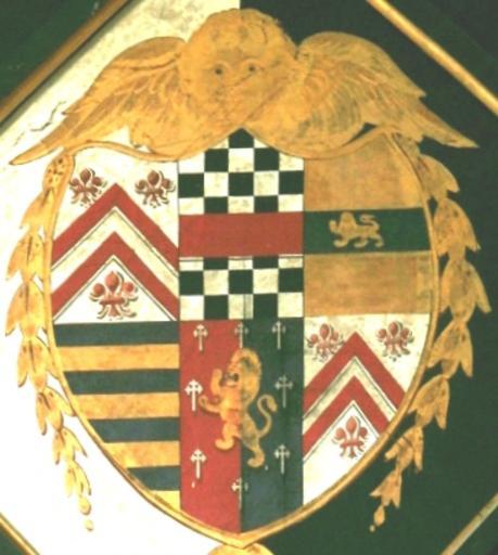 Keywords: BarborFamily FuneralHatchment FremingtonChurch Devon.JPG en Funeral hatchment detail of Barbor family of Fremington House North Devon St Peter's Church Fremington west wall Display the arms of Barbor with six quarters See Summers Peter Titterton John eds Hatchments in Britain Vol 7 Cornwall Devon Dorset Gloucestershire Hampshire Isle of Wight and Somerset; Phillimore Press Chichester Sussex 1988 p 24 no 3 1st 6th Argent two chevrons between three fleurs-de-lys gules Barbor ; 2nd Chequy argent and sable a fesse gules Acland ; 3rd Argent on a fesse wavy azure a lion passant or Lovering of Bittadon given incorrectly by Summers as Hussey field shown here as or with lion guardant ; 4th Barry of eight or and gules Pointz of Bittadon Devon and Poyntz of Iron Acton Gloucestershire shown here with different tinctures perhaps faded/oxidised ; 5th Per pale gules and azure semée of crosses crosslet fitchée argent a lion rampant or Hutchinson own photo Lobsterthermidor <span class signature-talk ></span> 17 48 16 November 2014 UTC 2014 Fremington Devon Barbor of Fremington arms Acland arms Lovering arms Poyntz arms Hatchments in Devon Interiors of churches in Devon |