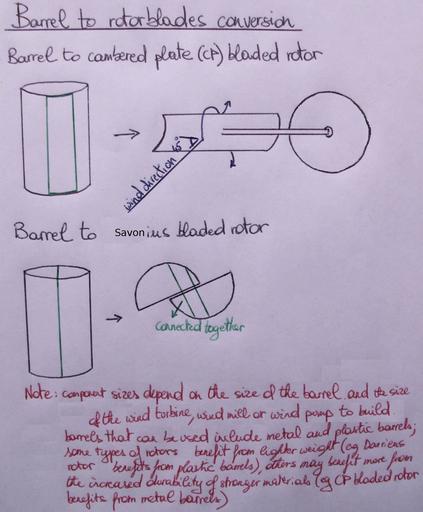 | Keywords: Barrel to rotor blades conversion.JPG en A schematic showing how a barrel can be converted for use in a wind turbine wind mill or wind pump The schematic was hand drawn based on an image taken from the videos at http //www natgeochannel co uk/programmes/planet-mechanics/videos/low-tech-pump and http //www berezin com/jeff/2008/03/vawt-video html Own KVDP 2009-09-13 Savonius wind turbines | ||||