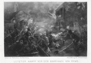 Keywords: Barricade-beaune.jpg en End of French attack against the barricade Prussian closing the road Boiscommun / Orme on the evening of November 28 1870 fr Dernier assaut des Français contre la barricade Prussienne fermant la route de Boiscommun/Orme le soir du 28 Novembre 1870 Geschicht des Westphalish Infanterie-regiment Nr16 Mattschass 1900 PD-old Battles of the Franco-Prussian War French army 1870-1914 |