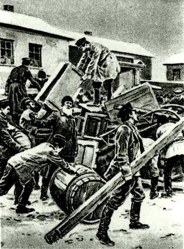 Keywords: Barricades.jpg ru Ст оительство ба икад на Васильевском ост ове 9 янва я 1905 года Рисунок неизвестного художника Пе вая усская еволюция 1905 - 1907 гг Госполитиздат 1955 author 1905 Bloody Sunday 1905 PD-old