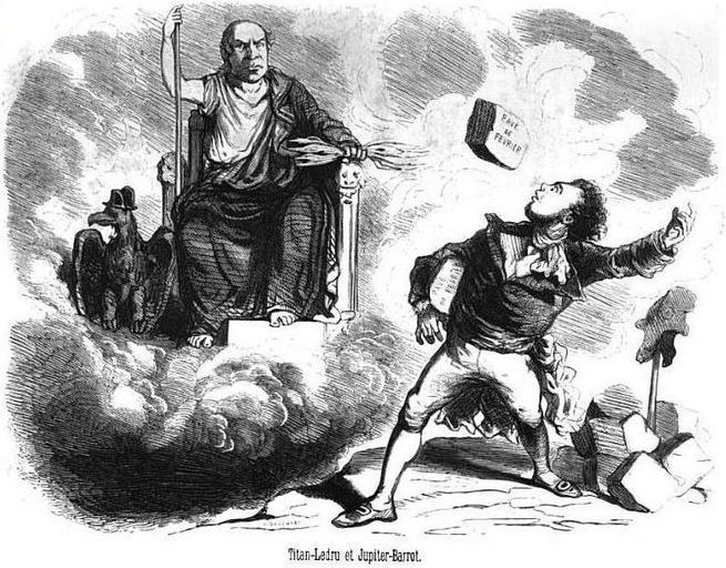 Keywords: Barrot-Jupiter contre Titan-Ledru par Cham.JPG fr Titan-Ledru et Jupiter-Barrot par Cham Parodie mythologique de la lutte entre le gouvernement de droite composé en accord avec le Parti de l'Ordre par le président Louis-Napoléon Bonaparte évoqué ici par l'aigle coiffé du chapeau de Napoléon dirigé par Odilon Barrot en 1848-49 et l'opposition républicaine de gauche menée par Ledru-Rollin Auguste Lireux Assemblée nationale comique Michel Lévy Frères Paris 1850 Cham Amédée de Noé 1850 PD-Art Assemblée nationale comique by Cham Barrot Odilon Barrot Alexandre Auguste Ledru-Rollin Titanomachy Phrygian caps Cobblestones |