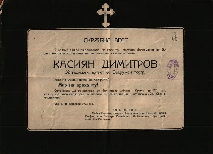 | Keywords: BASA-1154K-1-252-18-Kasiyan Dimitrov Obuituary.JPG ек олог на Касиян Димит ов Kasiyan Dimitrov Obuituary Կասիյան Դիմիտ ովի մահախոսականը 1922-12-26 author ЦДА 1154K Иван Попов 1 252 18 credit line exhibition history BASA Спасими <span class signature-talk >talk</span> 2015-04-17 other versions Anonymous-EU Obituaries of Bulgaria Kasiyan Dimitrov 1922 obituaries | ||||