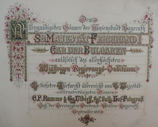 | Keywords: BASA-3K-7-359-1-Intro.jpg Изгледи от Бай ойт Ге мания пода ени на ца Фе динанд по случай 25 години от възшествието му Септемв и 1912 г Views and photos of Bayreuth Germany gifted to Ferdinand I of Bulgaria to commemorate his 25-year rule September 1912 1912-09 author ЦДА 3K она хически институт 7 359 1 credit line exhibition history BASA ShockD <span class signature-talk >talk</span> 2016-11-08 other versions Anonymous-EU Ferdinand I of Bulgaria Documents in the Bulgarian Archives Germany in the Bulgarian Archives |