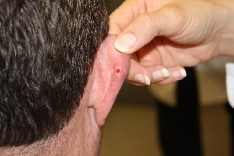 Keywords: Basal cell carcinoma (1).jpg A red ulcerated lesion surrounded by a white border on the skin of the right ear Ulcerated basal cell carcinoma with characteristic pearly rim Topics/Categories Anatomy -- Skin Cancer Types -- Skin Cancer Cells or Tissue -- Abnormal Cells or Tissue Type Color Photo Source National Cancer Institute Kelly Nelson Photographer 9235 2012-03-02 Reuse Restrictions None - This image is in the public domain and can be freely reused Please credit the source and/or author listed above Kelly Nelson Photographer PD-USGov-HHS-NIH Media from National Cancer Institute Visuals Online Images uploaded by Fæ Basal-cell carcinoma |