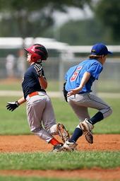 Keywords: baseball collision little league sport game boy young competition male base diamond helmet glove ballpark park action bumping competitive activity running