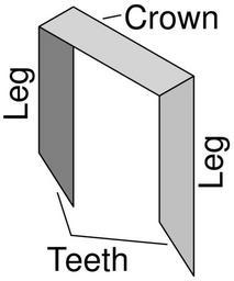 Keywords: Basic staple diagram (named parts).svg Basic abstract diagram of a staple with parts labelled Shown in isometric-projection pseudo-perspective not true perspective view Self-made SVG file based loosely on File Staplediagram JPG Converted from the following PostScript vector source code <pre> 160 0 translate 1 setlinejoin 3 setlinewidth 0 600 moveto 0 -437 5 rlineto -75 118 rlineto -75 600 3 sqrt 25 mul sub lineto closepath gsave 128 255 div setgray fill grestore stroke 0 600 moveto 262 5 3 sqrt -87 5 mul rlineto -75 3 sqrt -25 mul rlineto -262 5 3 sqrt 87 5 mul rlineto closepath gsave 212 255 div setgray fill grestore stroke 262 5 600 87 5 3 sqrt mul sub moveto 0 -437 5 rlineto -75 118 rlineto 187 5 600 112 5 3 sqrt mul sub lineto closepath gsave 192 255 div setgray fill grestore stroke 205 80 moveto -210 20 rlineto -30 94 rlineto stroke 64 574 moveto 40 8 rlineto stroke gsave 1 0 0 setrgbcolor 1 setlinewidth -160 615 moveto 350 615 lineto 350 0 lineto -160 0 lineto closepath stroke grestore /Helvetica 72 selectfont -58 22 moveto T show -5 0 rmoveto eeth show 110 552 moveto Crown show 90 rotate 200 -325 moveto Leg show 350 100 moveto Leg show showpage EOF</pre> 2010 AnonMoos Staples fasteners Isometric projection Images with PostScript source code |