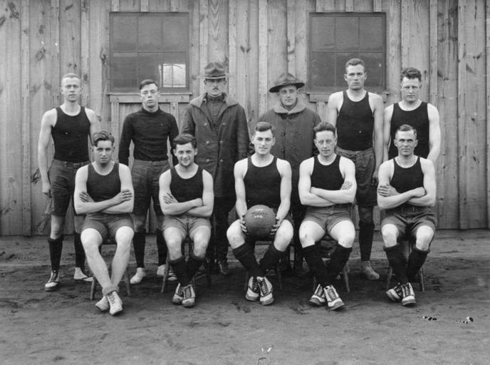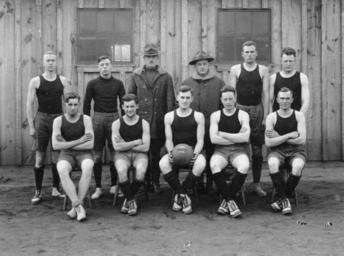 Keywords: blackandwhite people monochrome team sport sport black and white 2014-0996m Description: Basketball team at Fort Riley (fifth from left in back row is Gustav A. Haury, Jr.) Date: ca. 1918 Location: Fort Riley, Kansas MLA filing: World War I -Mennonite COs (4) Original Size: 20 x 15 cm Note: Camp Vail may have been a part of Fort Riley Note: Back of photo reads "Coach Haury at Fort Riley approx. 1918" 2014-0996m Description: Basketball team at Fort Riley (fifth from left in back row is Gustav A. Haury, Jr.) Date: ca. 1918 Location: Fort Riley, Kansas MLA filing: World War I -Mennonite COs (4) Original Size: 20 x 15 cm Note: Camp Vail may have been a part of Fort Riley Note: Back of photo reads "Coach Haury at Fort Riley approx. 1918" |