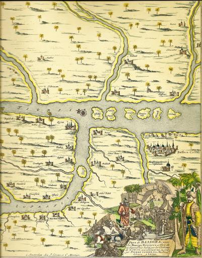 Keywords: Basra, Galérie agréable du Monde.jpg de Karte der Gegend von Basra 17 Jahrhundert <br /> Der Leidener Verleger Pieter van der Aa 1659-1733 veröffentlichte nicht nur Einzelkarten und Atlanten sondern gab auch mehrere Bücher heraus in die er viele Karten und Ansichten aufnahm In seinem größten Kartenbuch der žGalérie agréable du Monde die er 1729 mit 27 Bänden abschloß befanden sich über 3000 Kupferstiche die von den besten holländischen Graveuren stammten Dieser Publikation ist die hier abgebildete Karte des südlichen Mesopotamien entnommen <br /> Basra der Hauptort der gleichnamigen Provinz war lange Zeit ein wichtiger Stapelplatz des arabischen Seehandels dessen Verbindungen bis nach China reichten Anfang des 17 Jahrhunderts schüttelte ein mächtiger einheimischer Großgrundbesitzer Afrasiyab das seit 1534 bestehende türkische Joch vorübergehend ab und ernannte sich selbst zum Fürsten Emir des Gebietes am Schatt el-Arab Er knüpfte mit den Portugiesen Beziehungen an worauf diese in der Stadt eine Handelsniederlassung errichteten und sogar eine Kirche erbauen durften <br /> In der Titelkartusche hielt der Künstler einige Wesenszüge des Landes fest So versinnbildlichen die beiden Flussgötter die großen Ströme Euphrat und Tigris Die Hirten mit ihren Viehherden sowie die Dattelpalmen weisen auf die wichtigsten Handelsgüter hin während die moslemischen Krieger die Unabhängigkeit des Fürstentums demonstrieren <br /> en A Map of the Basra Region 17th century <br /> The Leyden publisher Pieter van der Aa 1659-1733 did not publish individual maps and atlases only but also edited several books in which he included many maps and views His largest map collection the Galérie agreeable due Monde which he concluded with 27 volumes in 1729 contained more than 3 000 copperplates which were supplied by the best Dutch engravers This map of southern Mesopotamia has been taken from that publication <br /> Basra principal town of the same province was for a long time an important staple of Arabian sea-borne trade whose connections reached to China Early in the 17th century a powerful local landed proprietor Afrasiyab managed to temporarily shake off Turkish rule which had been existing since 1534 an appointed himself the sovereign of the region at Shatt el-Arab He entered into relations with the Portuguese whereupon these set up a trading post and were even allowed to build a church a church in the town <br /> In this title cartouche the artist depicted some characteristic features of the country The river-gods allegorize the large rivers Euphrat and Tigris The herdsmen with their stock and the date-palms hint at the most important commodities while the Moslem warriors demonstrate the independence of the principality <br /> fr Carte de la région de Basra 17e siècle<br /> Pieter van der Aa 1659-1733 éditeur de Leyde publiait non seulement de cartes individuelles ou de atlas mais aussi plusieurs livres dans lesquels il insérait beaucoup de cartes et de vues Dans son plus vaste livre aux cartes appelé « Galérie agréable du Monde » qu ™il acheva avec 27 tomes en 1729 se trouvaient plus de 3000 estampes établies par les meilleurs graveurs hollandais C ™est de cette publication que notre carte de Mésopotamie du sud a été prise <br /> Basra chef-lieu de la province de même nom était longtemps un important lieu d ™entrepôt du commerce maritime des Arabes dont le relation d ™affaires s ™Ã©tendaient jusqu ™en China Au commencement di 17e siècle un grand propriétaire Afrasiyab puissant de ce pays après s ™Ãªtre délivré passagèrement du joug turc ture qui avait existé depuis 1534 se nomma lui-même prince emir de la région du Chatt el-Arab Il entrait en affaires avec les Portugais et alors ceux-ci établirent un comptoir dans la ville et eurent même la permission d ™Ã©difier un église <br /> Dans la cartouche de titre l ™artiste traçait quelques traits essentiels de ce pays On y voit les dieux de rivières symbolisant l ™Euphrate et le Tigre ces grands fleuves de la Mésopotamie Les bergers avec leurs troupeaux ainsi que les dattiers renvoient aux biens de commerce les plus importants tandis que les guerriers musulmanes manifestent l ™indépendance de cette principauté Galérie agréable du Monde Pieter van der Aa 1659-1733 publisher 1729 PD-old-100 File Tigre et Euphrate jpg History of Basra Maps of Basra Province Shatt al-Arab PD-old-100 La Galerie Agreable du Monde |