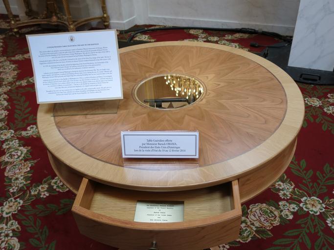 Keywords: Bastille key and gueridon table given by Barack Obama to François Hollande 1.jpg en Key of the fortress of la Bastille and gueridon table given by Barack Obama to François Hollande during the state visit from 10 to 12 february 2014 Shown in the palais de l'Élysée Paris France during the European Heritage Days 2014 The key is a replica of the one given by la Fayette to Georges Washington as symbol of freedom The guéridon table was made with the wood of a 235 years old oak planted during presidency of Georges Washington fr Clé de la Bastille et table guéridon donnés par Barack Obama à François Hollande lors de la visite d'état du 10 au 12 février 2014 Exposés au palais de l'Élysée Paris lors des Journées du Patrimoine 2014 La clé est une réplique de celle offerte par la Fayette à Georges Wahington comme symbole de liberté Le guéridon a été fabriqué avec le bois d'un chêne de 235 ans planté pendant la présidence de Georges Washington sf 2014-09-21 Tangopaso thumb left Close-up of the key European Heritage Days 2014 in Paris - Palais de l'Élysée Gifts to François Hollande Président de la République Guéridons Oak furniture |