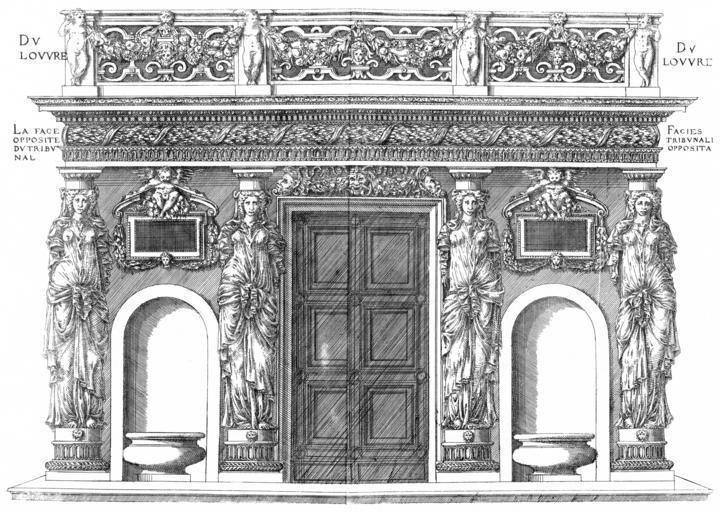 Keywords: Bastiments v1 (Gregg 1972 p26) - Louvre side opposite the tribunal.jpg Engraving from Le premier volume des plus excellents Bastiments de France by Jacques I Androuet du Cerceau showing the four caryatids sculpted by Jean Goujon in what is now called the Salle des Caryatides in the west wing Aile Lescot of the Louvre Palace Scan Androuet Jacques 1576 Le premier volume des plus excellents Bastiments de France Paris Reduced size reprint Gregg International 1972 ISBN 9780576154086 2014-05-21 11 55 19 Author info Jean Goujon sculptor m Author info Jacques I Androuet du Cerceau engraver m PD-Art-100 Le premier volume des plus excellents Bastiments de France Gregg 1972 reprint Caryatids by Jean Goujon at the Louvre 1576 Renaissance Louvre 1576 Architectural drawings of the Palais du Louvre 1576 |