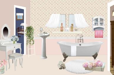Keywords: bathroom bath antique rug vintage hairdresser mirror window drapes cabinet peonies ivy washbasin sink bottles personal care products