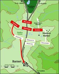 Keywords: Battle of Barnet, early-battle.svg en Battlefield map of the Battle of Barnet 14 April 1471 showing the initial force positions Base map http //www npemap org uk/tiles/map html 524 196 1 1945 Ordnance Survey New Popular edition maps of Barnet and Monken Hadley Crown copyrights has expiredhttp //www npemap org uk/tileLicence html Terrain details based on http //www british-history ac uk/mapsheet aspx compid 55128 sheetid 5425 England - Middlesex 006 Ordnance Survey 1 10 560 - Epoch 1 1873 Roads derived from Maps 18 and 19 of George Carrington Gray's http //books google co uk/books id UMMHAAAAQAAJ New Book of Roads Sherwood Jones and Co 1824 Deployment based on cite book Burne Alfred The Battlefields of England http //books google com/books id IzwOAAAAQAAJ p 110 2009-02-08 1950 Methuen and Company London The Battle of Barnet April 14th 1471 http //books google com/books id IzwOAAAAQAAJ pg PA108 cite book Gravett Christopher Tewkesbury 1471 The last Yorkist victory http //books google com/books id ok1Ql8fCLKAC pp 38 39 2009-01-16 Campaign 131 2003 Osprey Publishing Oxford 1-84716-514-7 Jappalang 2009-03-12 Battle of Barnet