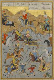 | Keywords: Battle between Alexander and Darius (with frame).jpg en Battle between Alexander and Darius Folio from a Khamsa Quintet of Nizami Date A H 931/A D 1524 “25 Geography present-day Afghanistan Herat Classification Codices This artwork is not on display accession number 13 228 7 15 credit line Gift of Alexander Smith Cochran 1913 object type Illustrated manuscript folio Painting Size cm 12 2 18 7 Page Size cm 22 2 32 1 Mat Size cm 36 2 48 9 Ink opaque watercolor and gold on paper A H 931/A D 1524 “25 http //www metmuseum org/Collections/search-the-collections/140003828 rpp 20 pg 10 ao on ft battle pos 188 Sultan Muhammad Nur ca 1472 “ca 1536 Nizami Ilyas Abu Muhammad Nizam al-Din of Ganja probably 1141 “1217 Battle between Alexander and Darius jpg PD-old Darius I Folio from a Khamsa (Quintet) of Nizami Date: A.H. 931/A.D. 1524–25 Geography: present-day Afghanistan