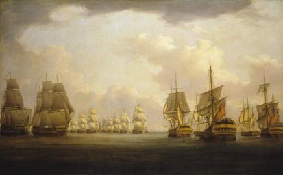 Keywords: Battle of Cape Finisterre.jpg Artwork Creator William Anderson painter en 'Admiral Sir Robert Calder's action off Cape Finisterre 23 July 1805' Vice-Admiral Calder ™s squadron intercepted the Franco-Spanish fleet under Admiral Villeneuve off north-western Spain as it returned from its diversionary voyage to the West Indies just before Trafalgar At a time when Britain had become used to Nelsonic victories Calder ™s failure to engage it decisively led to his formal censure and he was never given another command This shows the day after the action 24 July British frigates have Calder ™s two prizes the Firme and the San Raphael under tow on the right and the damaged Windsor Castle too on the left Calder ™s fleet is in formation in the centre and the departing enemy in the distance<ref>http //collections rmg co uk/collections/objects/12031 html National Maritime Museum</ref> reflist > 1805 oil canvas cm 77 5 123 0 National Maritime Museum object history credit line accession number BHC0539 first upload http //www nmm ac uk/collections/nelson/viewRepro cfm reproID BHC0539 picture 1 content Collections of the National Maritime Museum<br/>second upload http //collections rmg co uk/collections/objects/12031 html Royal Museums Greenwich PD-old-100 PD-US William Anderson painter Paintings in the National Maritime Museum London 19th-century paintings of naval battles 1805 Naval battles of the Napoleonic Wars Conflicts in 1805 19th-century sailing ships in paintings Sailing ships of the United Kingdom |