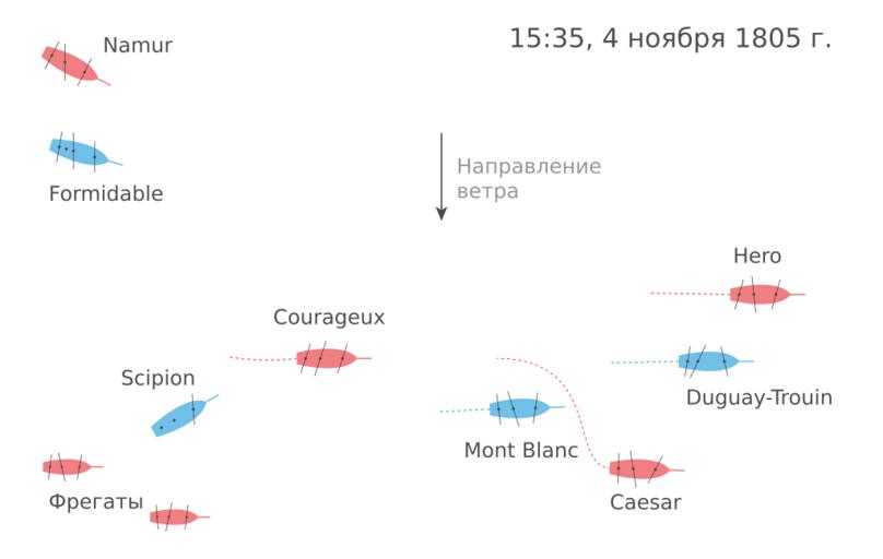 Keywords: Battle of Cape Ortegal 3h 35m pm.svg en Battle of Cape Ortegal 3h 35m pm 4 November 1805 ru Положение б итанских и ф анцузских ко аблей в с ажении п и мысе О тегаль по состоянию на 15 35 4 нояб я 1805 года http //freepages genealogy rootsweb ancestry com/~pbtyc/Naval_History/Vol_IV/Vol_IV_P_111 htm 1827 own 2014-04-05 translate Battle of Cape Ortegal Cc-zero
