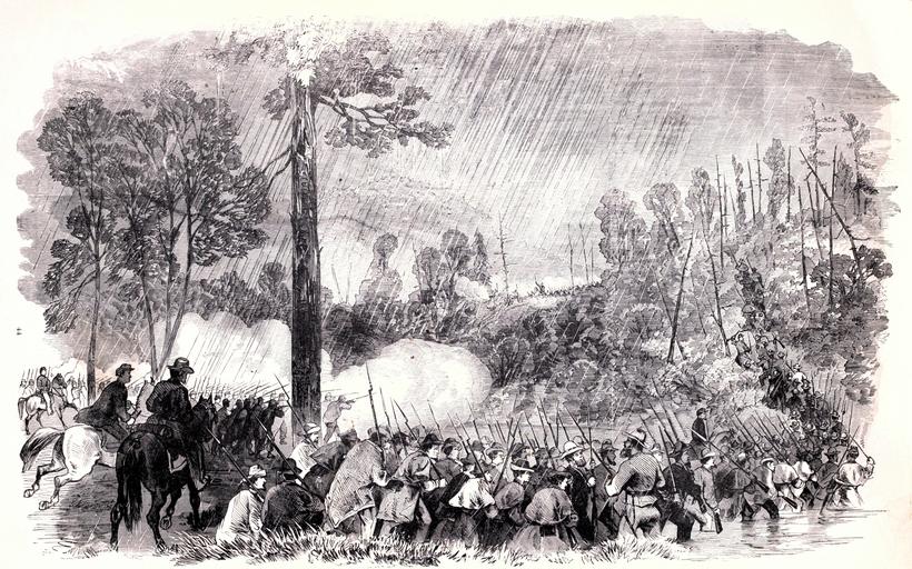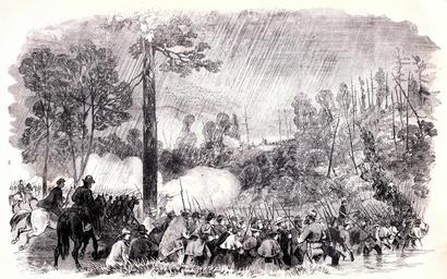 Keywords: outdoor (from Frank Leslie's Illustrated History of the Civil War..., edited by Louis Shepheard Moat, Published by Mrs. Frank Leslie, New York, 1895) "After a long march through drenching rain, the Federal troops under General Morris reached Carrick's Ford, where they found the Confederates holding the cliff on the opposite bank of the river. Both sides began a heavy firing. Then the Seventh Indiana Regiment plunged into the river and scaled the cliff on the right of the enemy, while the others kept up the fight in front. As soon as the flanking party reached the top of the cliff the Confederates retreated, and were pursued for about two miles." (from Frank Leslie's Illustrated History of the Civil War..., edited by Louis Shepheard Moat, Published by Mrs. Frank Leslie, New York, 1895) "After a long march through drenching rain, the Federal troops under General Morris reached Carrick's Ford, where they found the Confederates holding the cliff on the opposite bank of the river. Both sides began a heavy firing. Then the Seventh Indiana Regiment plunged into the river and scaled the cliff on the right of the enemy, while the others kept up the fight in front. As soon as the flanking party reached the top of the cliff the Confederates retreated, and were pursued for about two miles." |