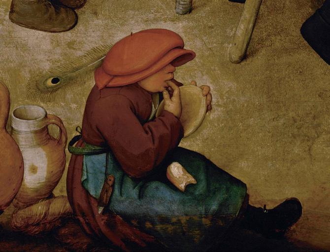 Keywords: Bauernhochzeit (Kind im Vordergrund).jpg Ausschnitt aus dem Gemälde Die Bauernhochzeit File Pieter Bruegel the Elder - Peasant Wedding - Google Art Project jpg ~ 1568 creator Pieter Bruegel the Elder PD-Art-100 Details of The Peasant Wedding Children eating in art Pottery in painting Peacock feathers in art Cántaros in art |