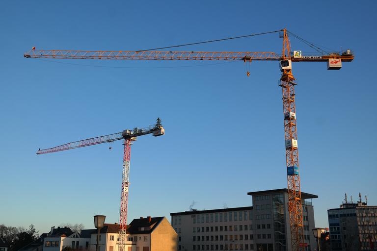 Keywords: baukran crane build site sky construction work lattice boom crane crane boom boom new ulm red yellow