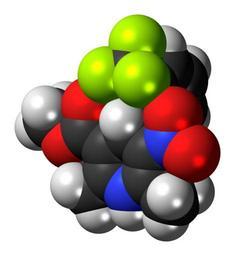 Keywords: Bay-K8644-3D-spacefill.png Space-filling model of the Bay K8644 molecule a calcium channel agonist Colour code 505050 Carbon C black<br> F0F0F0 Hydrogen H white<br> F51E1E Oxygen O red<br> 3C50FA Nitrogen N blue<br> C8FA00 Yellow-green Fluorine F<br> 2011-06-13 own DS Visualizer Jynto talk Ball-and-stick version cc-zero Carboxylate esters Methyl esters Nitro compounds Trifluoromethylbenzenes Images by Jynto Space-filling models Dihydroazines |