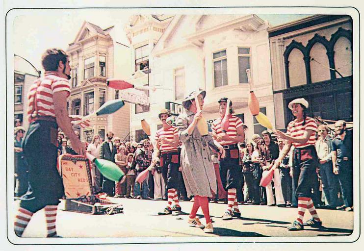 Keywords: Baycityreds castrostfair 1975.jpg en The Bay City Reds juggling troupe at the Castro Street Fair San Francisco 1975 Performers are from left Dan Mankin Billy Kessler Diana Don Forrest Merle Goldstone On Castro St near 18th St San Francisco CA USA Own BillyKwiki 1975 Own work all rights released 1975 in San Francisco Club juggling Castro Street San Francisco Circus performers 6 prop juggling |