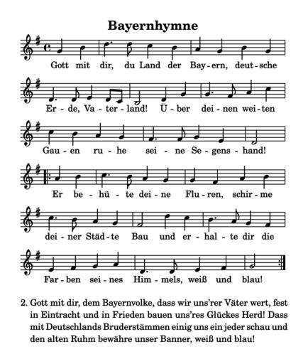 | Keywords: Bayernhymne.svg de Die Bayernhymne in der Form wie sie in der Bayerischen Verfassung steht en The Hymn of Bavaria as printed in the Bavarian constitution 2011-10-19 Selbst erstellt nach dem Notenblatt in der Verfassung des Freistaates Bayern Melodie Max Kunz; Urtext Michael Oechsner PD-old-100 Anthems Symbols of Bavaria Sheet music |
