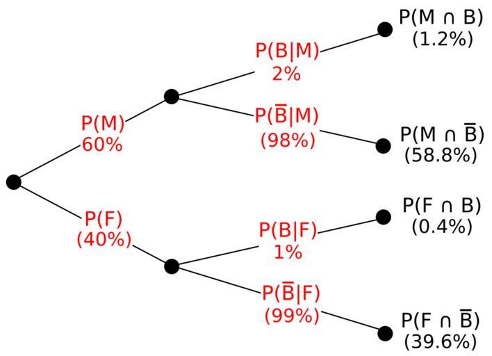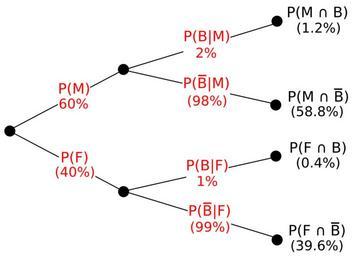 Keywords: Bayes theorem example tree.svg en Tree diagram illustrating simple example first saved to http //en wikipedia org/w/index php title Bayes 27_theorem oldid 445527554 M is the event that an individual is male F is the event that an individual is female B is the event that an individual is carrying a bottle B bar is the event that an individual is not carrying a bottle Percentages not shown in parentheses are given in the problem definition Percentages shown in parentheses are calculated 2011-08-18 own Gnathan87 cc-zero Check categories 2011 August 19 en wikipedia Bayes'_theorem 5 Uploaded with UploadWizard Bayes' theorem Tree diagrams |