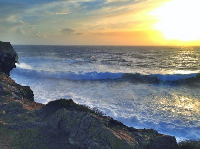Keywords: beach cliff ocean water rock sunset wave portugal