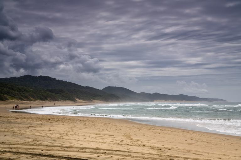 Keywords: beach coast shore water ocean sea breakwater waves wind spray foam grey sky clouds weather stormy people sand