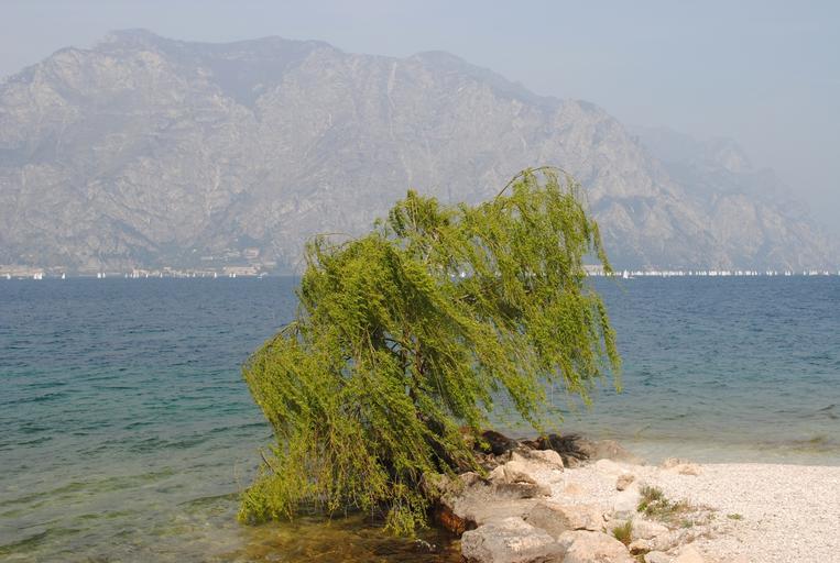 Keywords: beach garda bush green bush wind water sailing ships sailing regatta italy malcesine sky mountains bank