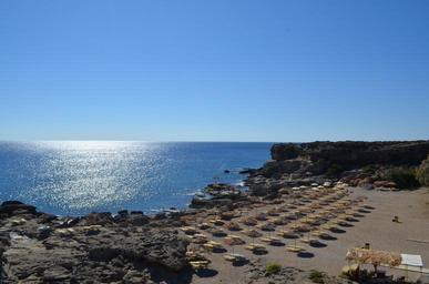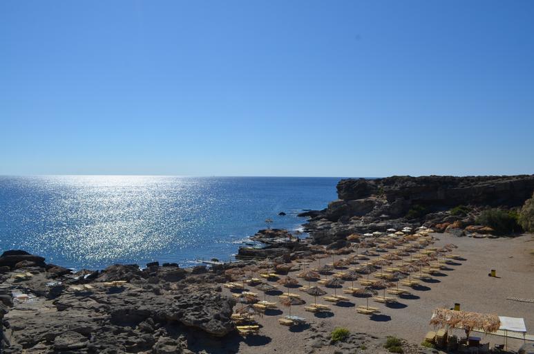 Keywords: beach greece beach umbrella sky sea holidays rhodes sun reflections rock sand sandy beach sunbeds relaxation