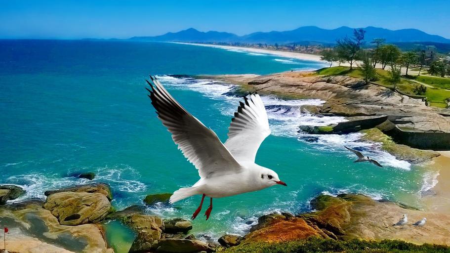 Keywords: beach orla litoral nature bird beira mar salt water waves ocean agua brazil landscape tranquility seagull rocks blue sky mar sand mountains island serra saquarema