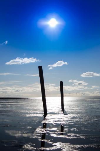 Keywords: beach piles sky horizon landscape view silent sun reflection