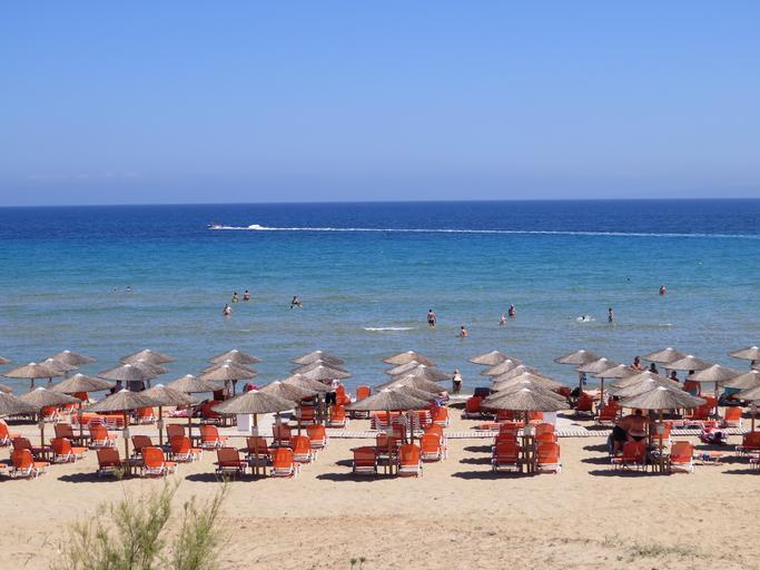 Keywords: beach sun loungers sea water beautiful beach waterfront holiday greece