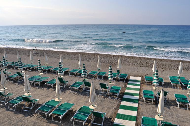 Keywords: beach sunbeds sand great blue green morning water summer seaside landscape nature
