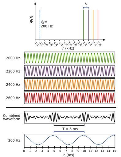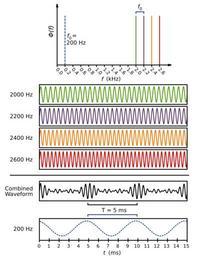 Keywords: Beat frequency (2000, 2200, 2400, 2600).svg en A diagram showing four sinusoids of frequencies 2000 2200 2400 and 2600 hertz green purple orange and red Also shown is the summed signal black and the sinusoid with the same period as the beat frequency f<sub>0</sub> 200 Hz Above is the spectrum of the signals own Inductiveload 2009-02-15 Beat frequencies Audiology Sensory Neuroscience Hearing and speech |