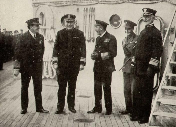 Keywords: Beatty Rodman KingGeorgeV KingEdwardVIII Sims.jpg David Beatty RN Rear Admiral Hugh Rodman USN King George V Prince Edward later King Edward VIII Vice Admiral William S Sims USN http //www firstworldwar com/photos/sea3 htm specifically http //www firstworldwar com/photos/graphics/hw_germfleetsurr_02 jpg here ; this image a crop of Underwood Underwood's original was first published in cite book March Francis Andrew Beamish Richard Joseph 1919 History of the World War John C Winston Company Philadelphia United States p 674 http //books google com/books id AGFJAAAAMAAJ pg PA674 2009-08-17 Underwood Underwood<ref> cite book Thomas John Gilbert Bigwood Inez 1919 Winning a Cause World War Stories Silver Burdett Company United States p 189 http //books google com/books id yv0WAAAAYAAJ pg PA189 2009-08-17 </ref> 1918-07-22 PD-Underwood References reflist David Beatty George V of the United Kingdom Edward VIII of the United Kingdom Underwood Underwood Hugh Rodman William Sims |
