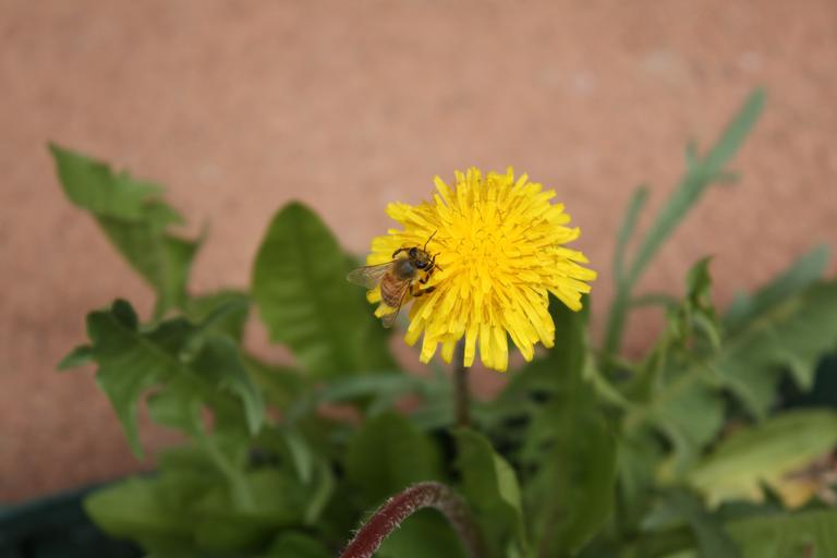 Keywords: bee flower dandelion pollination blooming single one outdoor green yellow petals pollen adobe bloom plant eat collect honeybee bumblebee bug insect arthropod wings