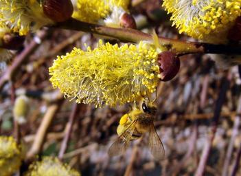 Keywords: bee march pasture honey bee work collect honey yellow pussy willow spring beekeeper collection bag hard working diligence macro