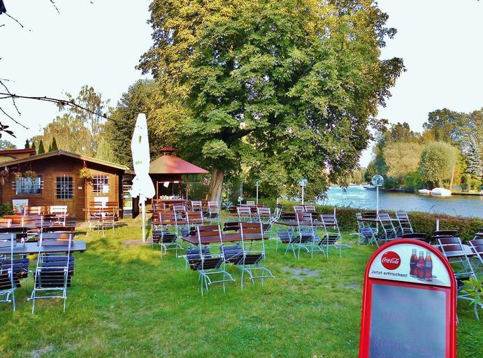 Keywords: beer garden restaurant gastronomy meadow outside catering seats out idyllic rest water spree september