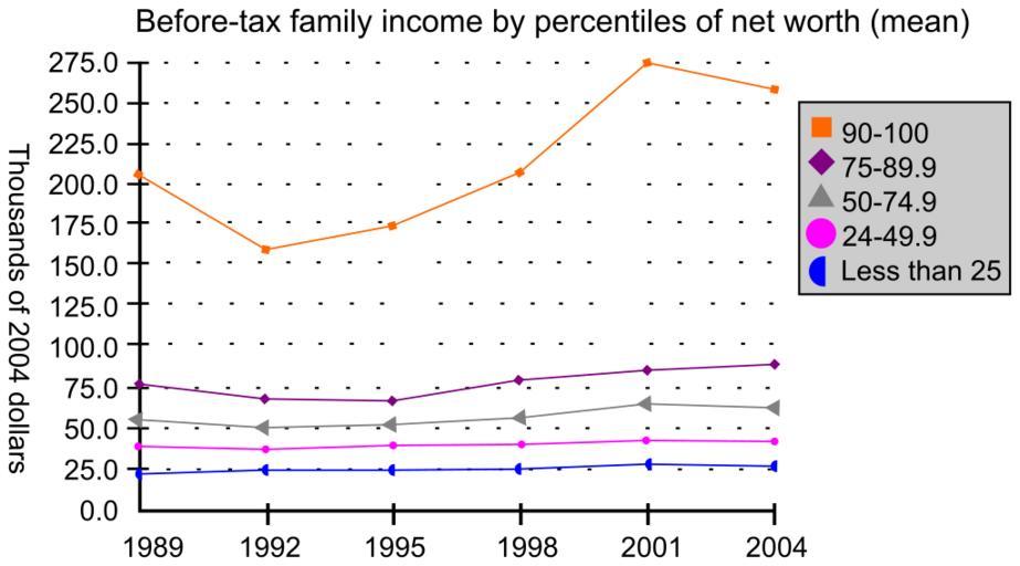 Keywords: BeforetaxfamilyincomemeanUS1989-2004.svg en Mean before-tax family income by percentiles of net worth in the USA from 1989-2004 In other words this is US income distribution from 1989-2004 Created with OpenOffice Calc Data obtained from https //www federalreserve gov/pubs/oss/oss2/2004/Chartbook xls This chart is a retraced SVG copy of the original file File BeforetaxfamilyincomemeanUS1989-2004 gif by en User Analoguni The original was released into public domain by the author; this SVG copy is also released into the public domain 2012-01-29 own traced original by en User Analoguni Premeditated Chaos File BeforetaxfamilyincomemeanUS1989-2004 gif cc-zero Check categories 2012 January 30 en wikipedia Household_income_in_the_United_States 2 Uploaded with UploadWizard Income distribution in the United States |
