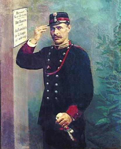 Keywords: BehrensKurpolizist.jpg 1898 oil on canvas 69 x 55 5 cm Touriseum - Landesmuseum für Tourismus - Schloss Trauttmansdorff object history exhibition history credit line signed and dated bottom left F Behrens / Meran 98 / P ortraitmaler accession number 4070097 Ferdinand Behrens 1898 portrait paintings History of Meran 19th-century portrait paintings of men at three-quarter length Uniforms of Austria PD-Art ImageNote 1 51 42 58 141 483 600 2 Meraner Kur-Ordnung Das Rauchen und Nachschleifen der Schleppe ist untersagt ImageNoteEnd 1 |