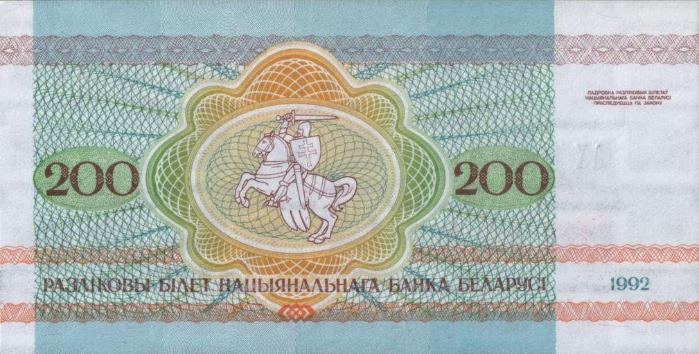 Keywords: Belarus-1992-Bill-200-Reverse.jpg be 200 ублёў 200 roubles of Belarus 1992 es 200 rublos 200 ублей Бело уссии 1992 own scan 1992 National Bank of Republic of Belarus ациональный банк Республики Бела усь ацыянальны Банк Рэспублiкi Бела усь PD-BY-exempt banknotes Banknotes of Belarus 1992 Pahonia on banknotes Banknotes with a face value of 200 |