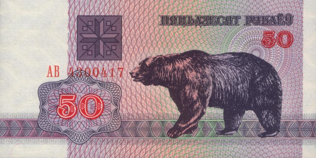 Keywords: Belarus-1992-Bill-50-Obverse.jpg be 50 ублёў 50 roubles of Belarus 1992 es 50 rublos 50 ублей Бело уссии 1992 own scan 1992 National Bank of Republic of Belarus ациональный банк Республики Бела усь ацыянальны Банк Рэспублiкi Бела усь PD-BY-exempt banknotes Banknotes of Belarus 1992 Bears on banknotes Banknotes with a face value of 50 Purple banknotes |