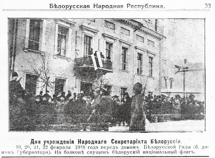 | Keywords: Belarusian national White-red-white flag, government of Belarusian Democratic Republic (Miensk, 1918).jpeg be-tarask Бела ускі нацыянальны Бел-чы вона-белы сьцяг над будынкам а однага Сак ата ыяту Бела ускае а однае Рэспублікі ў енску на Высокім Рынку 1918 ок Belarusian national white-red-white flag on a house of National Secretariat of Belarusian People's Republic 1918 http //suziralnik livejournal com/11294 html VAŠ SUZIRALNIK from Ва та - енск а одны Сак ата ыят Б Р 1918 author between 1918-02-19 1918-02-22 thumbnail left PD-old History of Minsk Minsk in the 20th century Belarusian People's Republic 1918 in Minsk |