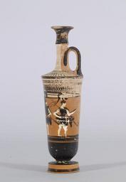 | Keywords: Beldam Painter - Three Amazons - Walters 48249 - Right.jpg Three Amazons on this black-figure lekythos face right and appear to march one after the other Their skin is white but their facial features eroded or rubbed away are indistinguishable Each wears a helmet holds a long spear and has a horizontal quiver The middle figure holds both hands near her waist; the other two have one hand raised Amazons are first mentioned in the Iliad 6 186 as allies of the Trojans; later authors emphasize their fearlessness and their status as foreigners They were introduced on Attic vases in the early 6th century BC and quickly became a popular subject Early black-figure depictions of Amazons resemble Greek warriors with one notable difference-their white skin color which identifies them as women In red-figure vases the Amazons acquire more feminine features and bodies and their foreigness is emphasized by their attire Scythian or Thracian clothing and subsequently Persian garb In some places in Greece Amazons were the object of cult Jennifer Larson 1995 111-16 has suggested that despite the fact that they were considered hostile to the Greeks their complete otherness from the Greek way of life also gave them protective powers and entitled them to be worshiped as heroines ca 500 BC terracotta cm 20 5 6 accession number 48 249 62 Joseph Brummer New York date and mode of acquisition unknown Henry Walters city Baltimore Walters Art Museum Henry Walters Acquired by Henry Walters 1924 Heroes Mortals and Myths in Ancient Greece The Walters Art Museum Baltimore; Frist Center for the Visual Arts Nashville; San Diego Museum Of Art San Diego; Alexander S Onassis Public Benefit Foundation USA New York 2009-2011 place of origin Attica Greece Walters Art Museum license Ancient Greek black-figure pottery in the Walters Art Museum Beldam Painter Media contributed by the Walters Art Museum needs category review Media contributed by the Walters Art Museum needs artist update |